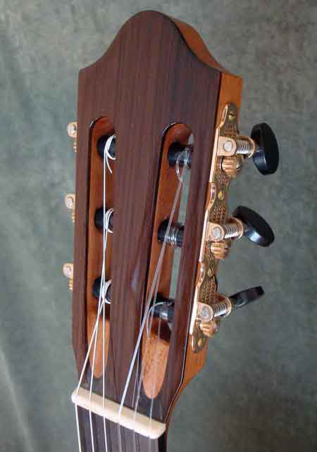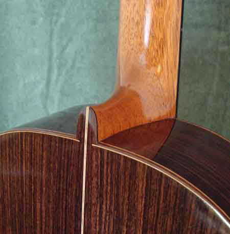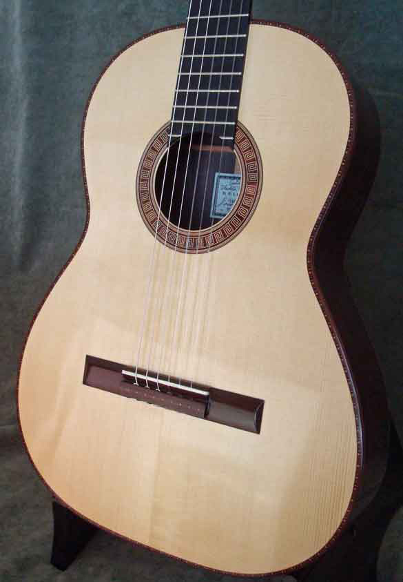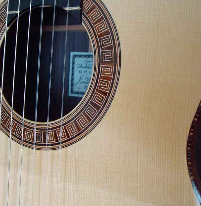 Number 95 by David LaPlante (SOLD) This guitar has beautifully quarter sawn East Indian Rosewood back and sides and an aged German Spruce top. The rosette is a unique Meander pattern in holly and Brazilian rosewood. Rosewood bindings with marquetry purflings accent the top. French polish finish with Sloane tuners.