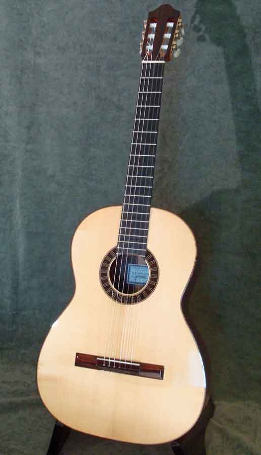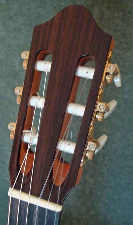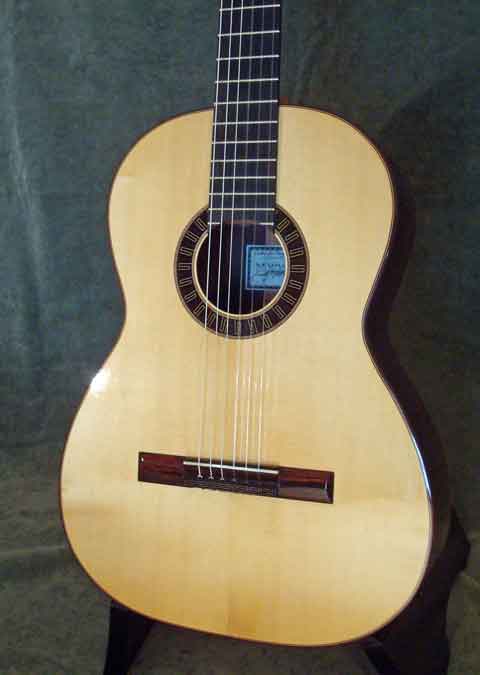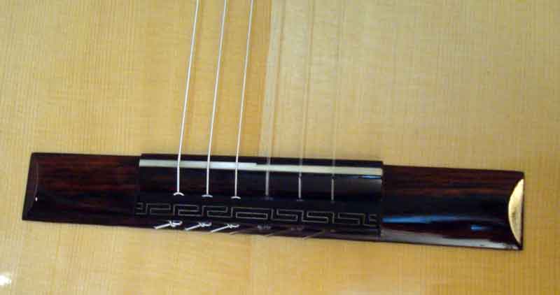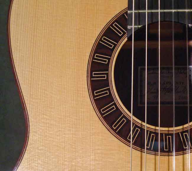 #99 by David LaPlante (SOLD) This elegant but simple guitar features an aged German spruce top, simple bold meander style rosette (similar to #92). Fine dark straight grained East Indian rosewood has been chosen for the back and sides with rosewood bindings and simple contrasting light purfling lines used to accent top back and side contours. A meander design derived from the #90 guitar has been used to adorn the bridge tie block. Sloane machines with white rollers and faux MOP buttons.